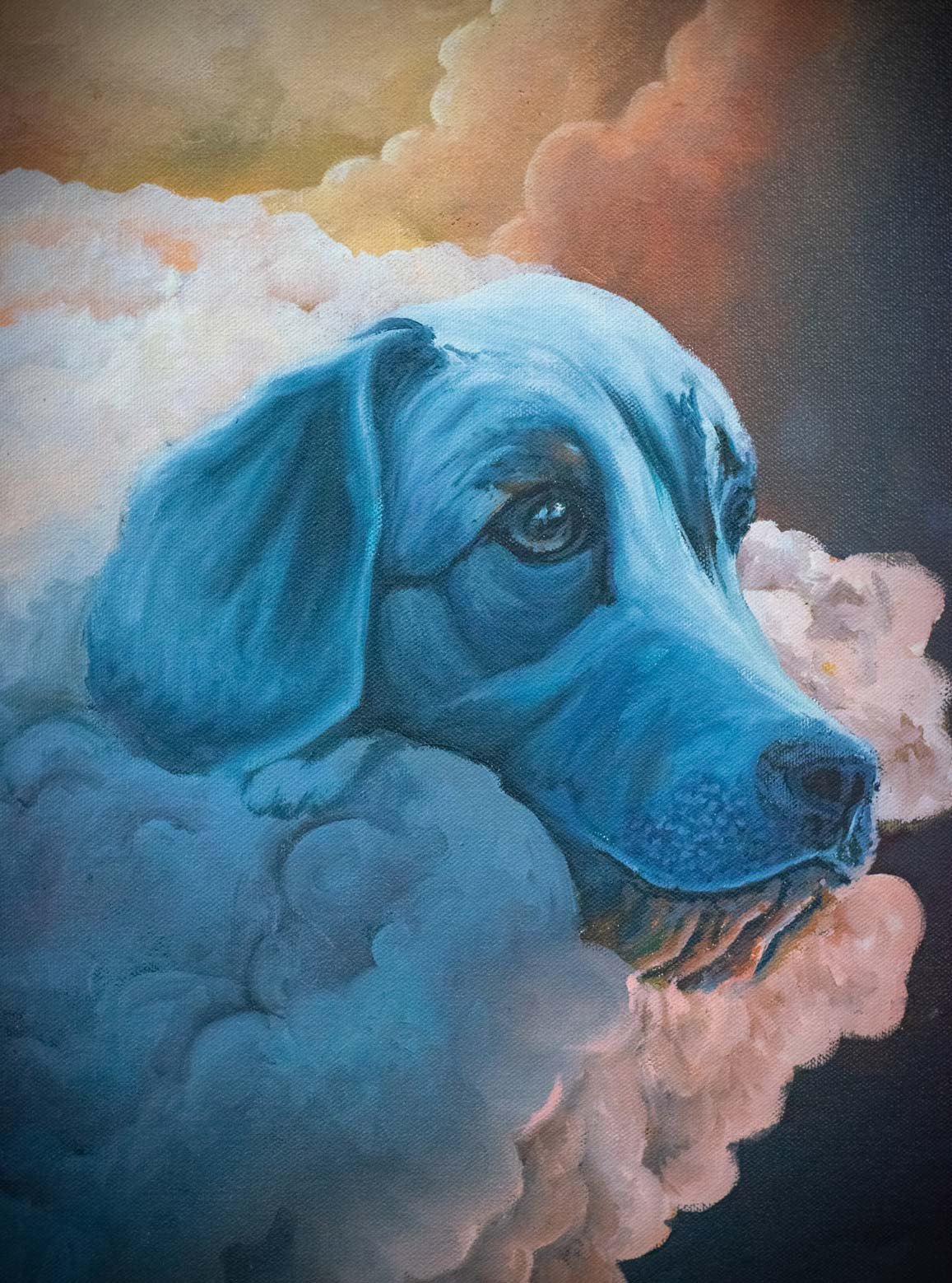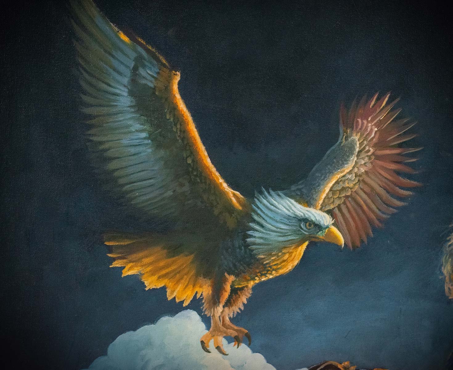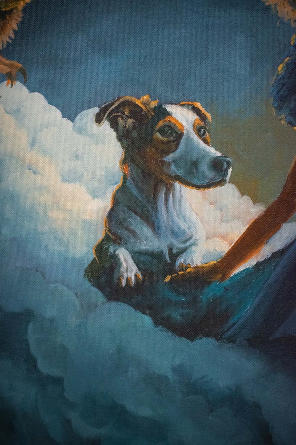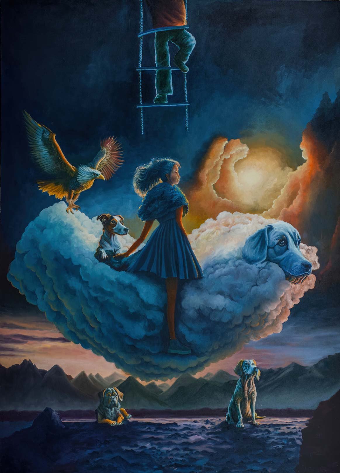 En el centro de la composición, una figura femenina se erige sobre una nube que desafía la gravedad, rodeada por una guardia de afectos: sus mascotas y un águila majestuosa. Esta iconografía, que remite inevitablemente a la ascensión y a la gloria celestial de la tradición religiosa, es reinterpretada como un refugio seguro. Aquí, el «paraíso» deja de ser una promesa dogmática para convertirse en un escenario de resistencia artística.